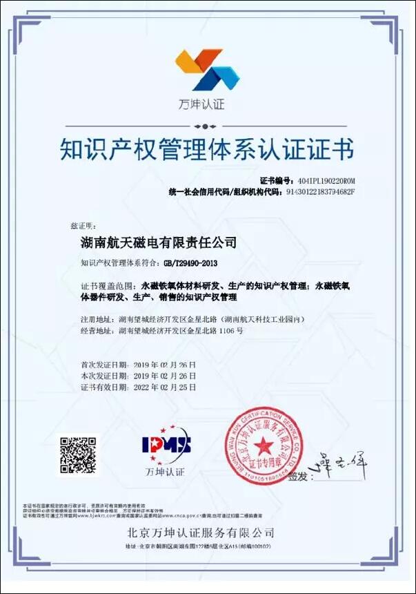 近日,湖南磁電正式獲得由北京萬坤認證服務(wù)有限公司頒發(fā)的《知識產(chǎn)權(quán)管理體系認證證書》(證書編號:404IPL190220R0M)。根據(jù)《湖南航天2018年知識產(chǎn)權(quán)工作要點》工作安排,湖南磁電是繼新材料院、三豐公司之后,湖南航天第三家獲得知識產(chǎn)權(quán)管理體系認證的企業(yè)。知識產(chǎn)權(quán)管理體系貫標旨在幫助企業(yè)建立科學(xué)、標準化的知識產(chǎn)權(quán)管理制度,形成貫穿生產(chǎn)經(jīng)營各個環(huán)節(jié)的知識產(chǎn)權(quán)管理體系,實現(xiàn)對知識產(chǎn)權(quán)的獲取、維護、運用和保護,提升企業(yè)的國內(nèi)、國際競爭力,保障企業(yè)的可持續(xù)發(fā)展。