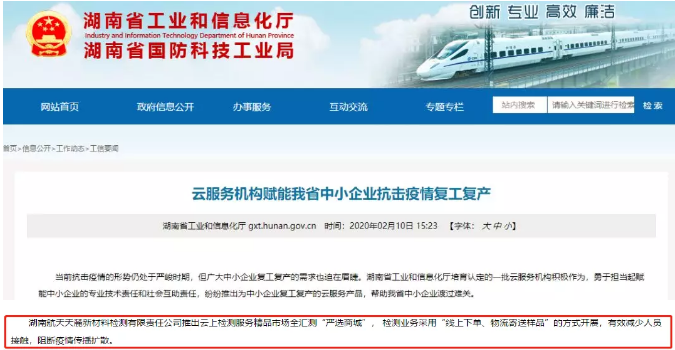 湖南航天天麓公司全匯測(cè)“嚴(yán)選商城”成功入選湖南省工業(yè)和信息化廳培育認(rèn)定的云服務(wù)機(jī)構(gòu),助力中小企業(yè)復(fù)工復(fù)產(chǎn),為檢測(cè)產(chǎn)業(yè)持續(xù)發(fā)展保駕護(hù)航。