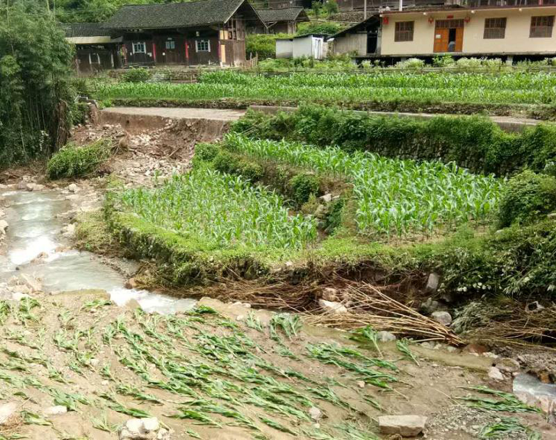2020年06月10日凌晨2點至6點,老天爺像一頭發(fā)怒的獅子侵襲了我們的村莊,整個松溪村頓時被這傾盆而下的暴雨籠罩,這是我見過村里下的一場最大的暴雨,村里的道路、耕地、農(nóng)作物、房屋都造成了不同程度損失,我們辛苦辛苦養(yǎng)殖的稻花魚被淹,剛插上的禾苗、玉米被沖走,道路塌方導(dǎo)致交通中斷,剛被修好的堤壩又受洪水的沖擊而產(chǎn)生裂縫,沖垮多處.一早發(fā)現(xiàn),泥沙、碎石已經(jīng)使整個村莊都凌亂不堪,所有的村民和我一樣,覺得上半年的辛苦勞作都功虧一簣。村民彭萬綠詳細描繪著那晚暴雨時的情景。