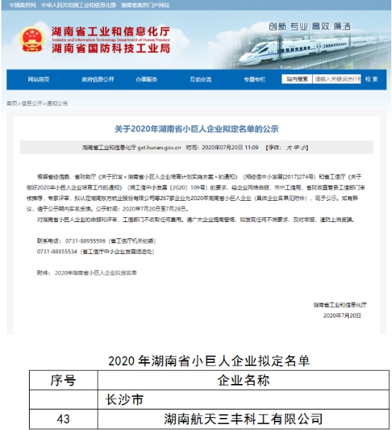 近日,湖南省工業(yè)和信息化廳官網(wǎng)關(guān)于2020年湖南省小巨人企業(yè)名單公示結(jié)束。經(jīng)市州工信局、省財(cái)政直管縣工信部門審核推薦、專家評審,認(rèn)定267家企業(yè)為2020年湖南省小巨人企業(yè),其中湖南航天三豐公司榜上有名。