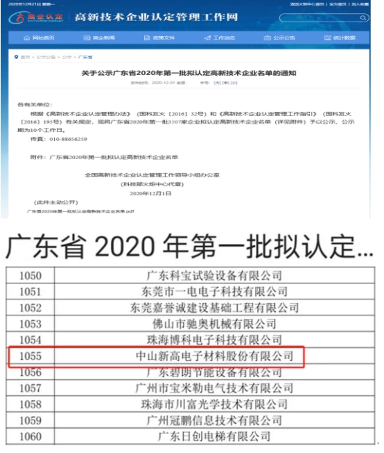 根據《高新技術企業(yè)認定管理辦法》(國科發(fā)火〔2016〕32號)和《高新技術企業(yè)認定管理工作指引》(國科發(fā)火〔2016〕195號)有關規(guī)定,對廣東省2020年共三批企業(yè)擬認定高新企業(yè)技術企業(yè)名單進行了公示,中山新高電子材料股份有限公司喜獲廣東省2020年第一批認定高新技術企業(yè)名單。這是繼2017年后,中山新高再次獲評國家高新技術企業(yè)。