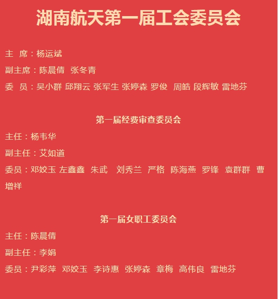 會(huì)上,湖南航天黨委副書記、副總經(jīng)理?xiàng)钸\(yùn)斌作《湖南航天有限責(zé)任公司工會(huì)第一屆第一次會(huì)員(職工)代表大會(huì)籌備工作報(bào)告》。湖南航天工會(huì)工作部副部長(主持工作)、黨群工作部副部長陳晨倩作《湖南航天有限責(zé)任公司工會(huì)第一屆會(huì)員代表大會(huì)代表資格審查報(bào)告》。湖南航天第一屆工會(huì)委員會(huì)(職工)代表121人,一線職工79人,占比65.29%,其中專業(yè)技術(shù)人員31人,一般管理人員32人、技能人員16人;工會(huì)工作者20人,占比16.53%;女職工45人,占比37.19%;中層以上管理人員及領(lǐng)導(dǎo)干部24人,占比19.83%。
