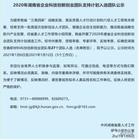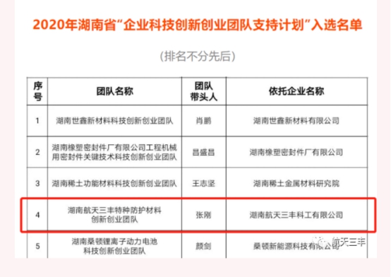 1月12日,湖南航天三豐科工有限公司特種防護(hù)材料創(chuàng)新創(chuàng)業(yè)團(tuán)隊(duì)成功獲批湖南省企業(yè)科技創(chuàng)新創(chuàng)業(yè)團(tuán)隊(duì)。
