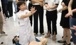 徐芙蓉通過人體模型、AED除顫儀,為學(xué)員開展心肺復(fù)蘇術(shù)、海姆立克急救法現(xiàn)場實操教學(xué)。學(xué)員們紛紛表示通過理論學(xué)習(xí)、現(xiàn)場實操,較好地掌握了心肺復(fù)蘇的操作要點,收獲頗豐。