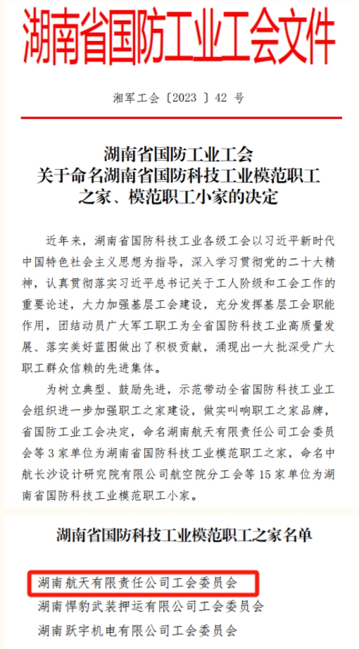1.湖南航天有限責(zé)任公司工會委員會獲評湖南省國防科技工業(yè)模范職工之家