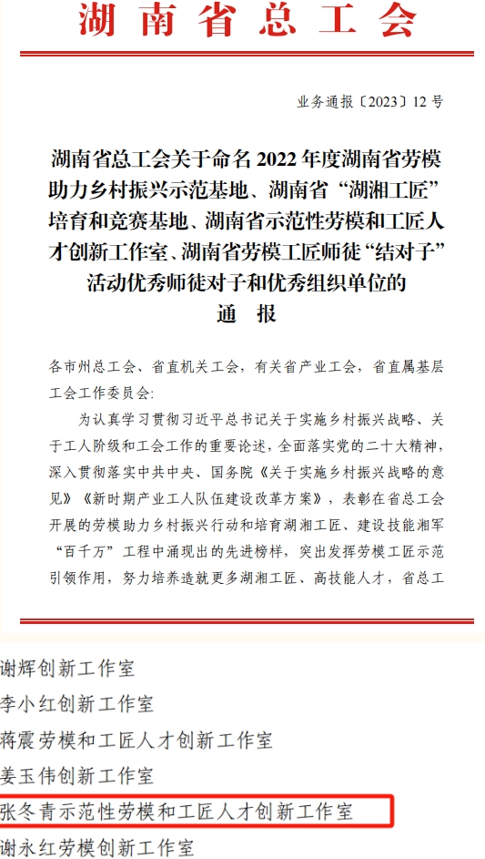 2.7801研究所張冬青示范性勞模和工匠人才創(chuàng)新工作室獲評2022 年度湖南省示范性勞模和工匠人才創(chuàng)新工作室