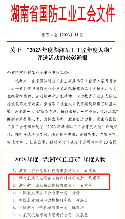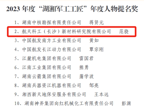 3.7801研究所戴昭軍、誠遠(yuǎn)公司石愛軍獲評2023 年度“湖湘軍工工匠”年度人物,新材料院范驍獲評2023 年度“湖湘軍工工匠”年度人物提名獎