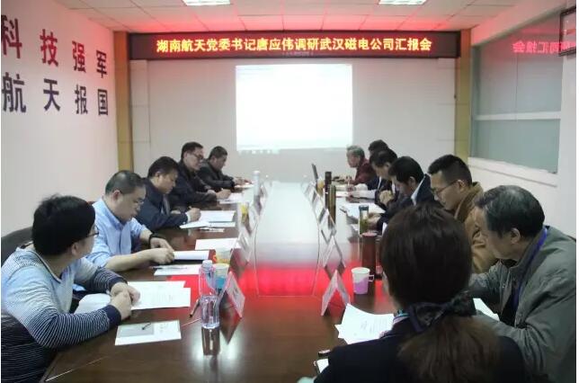 4月6日,湖南航天黨委書記、副董事長、副總經(jīng)理唐應偉,資深專務、武漢磁電公司董事長鮑定超,總經(jīng)理助理、科研生產(chǎn)部部長王永森,民用產(chǎn)業(yè)部副部長張志錄,科研生產(chǎn)部技術發(fā)展組組長陳瑤一行到武漢磁電公司調(diào)研。武漢磁電公司黨委書記、副總經(jīng)理馬克勤,副總經(jīng)理劉佑平,副總經(jīng)理、紀委書記蔡亞夫,副總經(jīng)理葉仁杰,科技委主任章超美,二級專務、工會主席徐維鵬陪同調(diào)研,作情況介紹。
