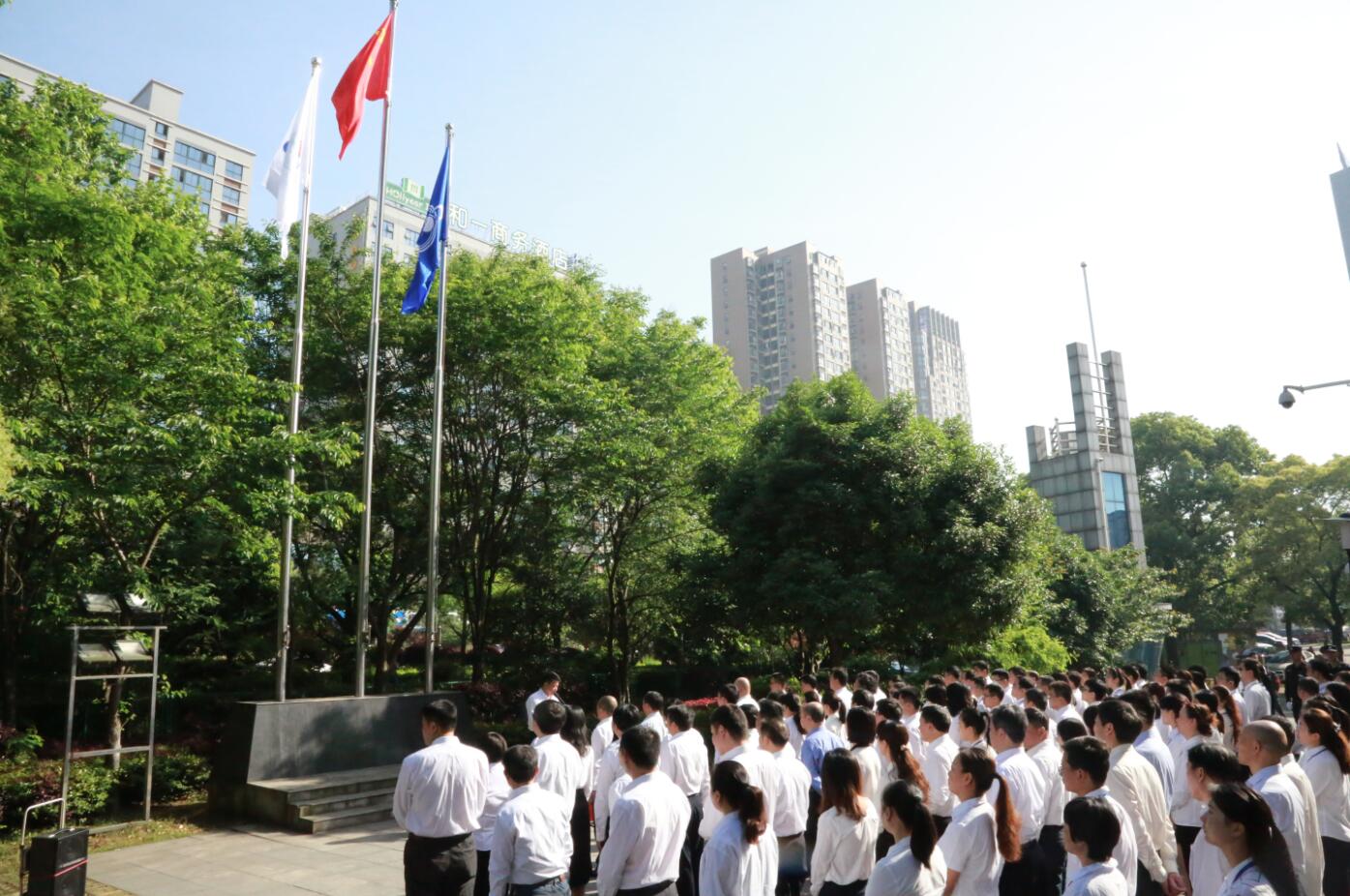 伴隨著激越昂揚(yáng)的《國歌》和《航天科工之歌》的音樂聲,科研樓前坪先后升起了鮮艷的國旗、中國航天科工集團(tuán)公司司旗。