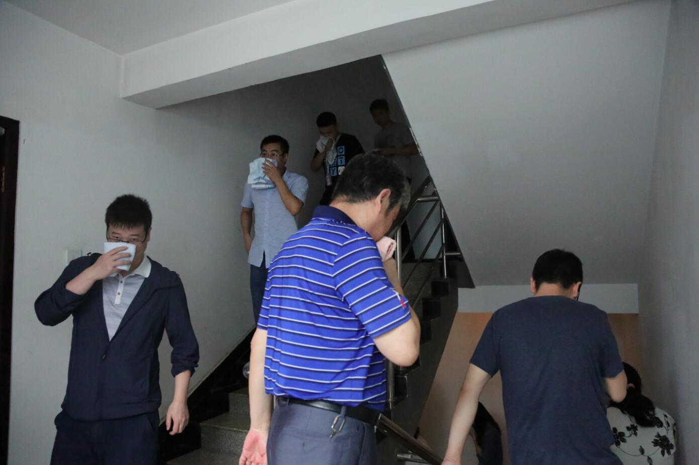 并指出本次演練為深入貫徹集團(tuán)公司關(guān)于開展消防安全“四個能力”建設(shè)的通知精神,檢驗(yàn)科研樓消防設(shè)施的功能,提高職工滅火、疏散、自救能力和管理者火場組織、協(xié)調(diào)、指揮能力。 本次演練模擬科研樓八樓著火。警報聲響起后,科研樓內(nèi)296名員工迅速組織疏散,紛紛以濕毛巾捂住口鼻、彎腰按照應(yīng)急疏散指示順著樓梯疏散到緊急集合點(diǎn)。消防支隊(duì)接警后迅速出動兩輛消防車、15名消防隊(duì)員,組成滅火組和搜救組,穿戴整齊消防隔熱服等裝備,滅火組鋪開并將消防水管接到八樓進(jìn)行滅火,搜救組到各樓層搜尋傷病人員;天頂派出所協(xié)助做好現(xiàn)場警戒工作;湖南航天醫(yī)院出動一輛救護(hù)車到現(xiàn)場,隨時準(zhǔn)備搶救受傷人員。