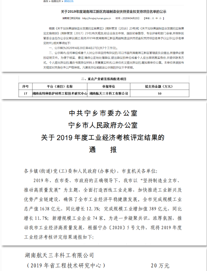近日,湖南航天三豐公司“湖南省特種防護(hù)材料工程技術(shù)研究中心”項(xiàng)目擬獲湖南湘江新區(qū)50萬元資金支持。該項(xiàng)目同時(shí)入選寧鄉(xiāng)市“工業(yè)企業(yè)品牌(平臺(tái))獎(jiǎng)”,并獲得20萬元獎(jiǎng)勵(lì)。