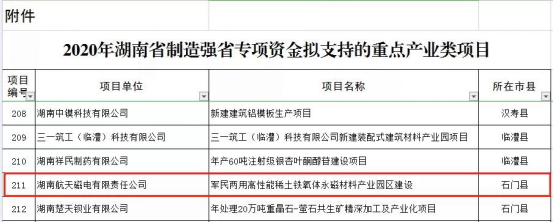 近日,湖南省工信廳正式公示2020年湖南省制造強省專項資金擬支持的重點產(chǎn)業(yè)類項目,湖南磁電的“軍民兩用高性能稀土鐵氧體永磁材料產(chǎn)業(yè)園區(qū)建設”項目成功入選。