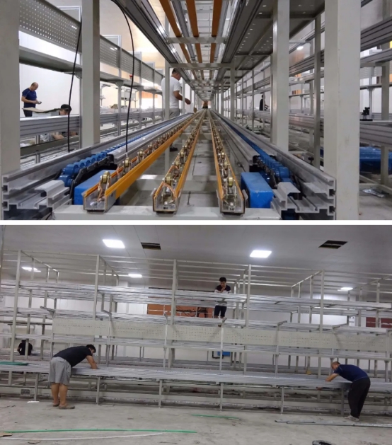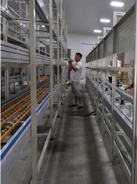 大家忙而不亂,協(xié)同奮戰(zhàn),多次加班加點(diǎn),根據(jù)建設(shè)方案的時(shí)間節(jié)點(diǎn)進(jìn)行趕工。目前包裝線、前測(cè)線、老化間、后測(cè)站、組裝端經(jīng)全部完工序的框架已經(jīng)搭建完畢,提升機(jī)、橫移機(jī)、頂升平移機(jī)等關(guān)鍵設(shè)備已經(jīng)安裝完畢。