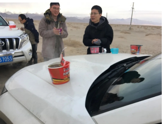 早上八點(diǎn)多,一切的裝調(diào)均已具備試驗(yàn)狀態(tài),只等甲方一聲令下。從凌晨的整裝出發(fā),一直持續(xù)到日上梢頭,再到設(shè)備調(diào)試完成后,我們的試驗(yàn)人員還需要在這樣的天氣里連續(xù)工作長(zhǎng)達(dá)兩個(gè)多小時(shí)。由于試驗(yàn)場(chǎng)地距離最近的居住區(qū)也有一個(gè)多小時(shí)的車(chē)程,試驗(yàn)隊(duì)的早午飯就只能靠方便面和自熱米飯等速食產(chǎn)品匆匆解決,接著又是長(zhǎng)達(dá)兩個(gè)小時(shí)的連續(xù)工作?!鞍?,發(fā)電機(jī)這么斷了?”“這個(gè)對(duì)講機(jī)怎么聽(tīng)不清”種種突發(fā)情況接踵而至,試驗(yàn)隊(duì)隊(duì)長(zhǎng)歐陽(yáng)康剛吃了兩口泡面就又要回到試驗(yàn)現(xiàn)場(chǎng)指揮解決各類問(wèn)題,試驗(yàn)隊(duì)員們立刻跟上前去,幾個(gè)來(lái)回,吃飯其實(shí)也變成了一項(xiàng)“意思一下”的事。