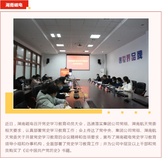 近日,湖南磁電召開黨史學(xué)習(xí)教育動員大會,迅速落實(shí)集團(tuán)公司黨組、湖南航天黨委相關(guān)要求,認(rèn)真部署黨史學(xué)習(xí)教育工作;會上傳達(dá)了黨中央、集團(tuán)公司黨組、湖南航天黨委關(guān)于開展黨史學(xué)習(xí)教育的會議精神和各項要求,宣布了湖南磁電黨史學(xué)習(xí)教育領(lǐng)導(dǎo)小組和辦事機(jī)構(gòu),全面部署了黨史學(xué)習(xí)教育工作;并為公司中層及以上干部和黨員購買了《論中國共產(chǎn)黨歷史》書籍。