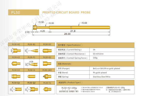 應用于PCB的測試探針規(guī)格最早的有P125、P100、P075、P50。針頭少量如:九爪頭、皇冠頭、三面錐型頭、杯型頭等。