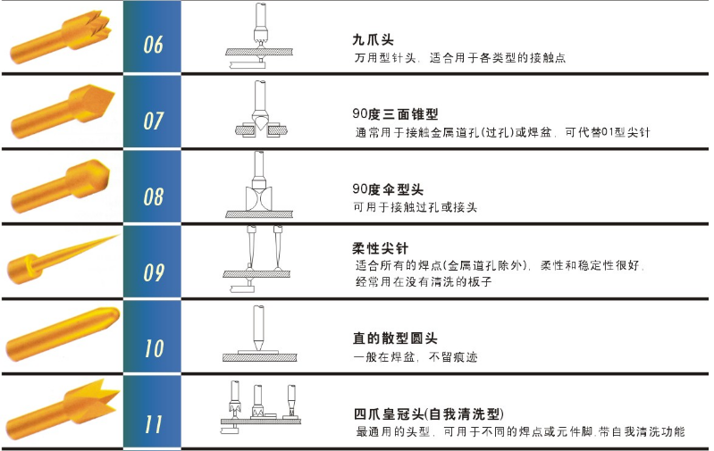 探針是用來測試線路板的開路或短路的,它的使用方法是通過傳輸電流或電壓信號來判斷線路板的情況,在測量中探針頭是主要使用的部位。目前最小的探針外徑可以做到0.2mm,通過這一點我們可以知道其實針頭的選擇是很有講究的,所以我們可以來看看幾種常見的頭型